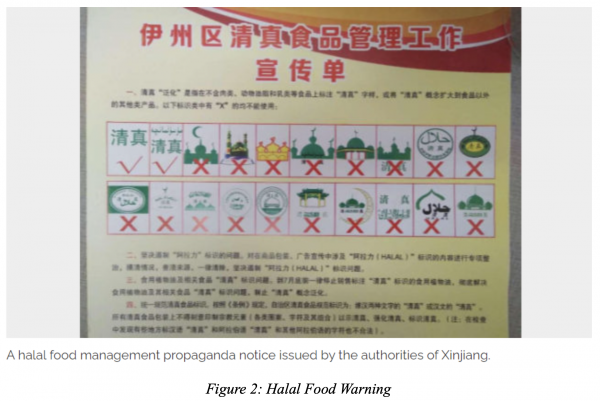 According to the reporting of Bitter Winter, the efforts to detain Uyghurs because of their religious behavior became more organized as the CCP established the “Ten-household Joint Defense Program.” This is a way for Han Chinese neighbors of Uyghurs to spy on them in a coordinated way and report them to the local authorities if they find them violating these discriminatory rules. They also put up notices threatening religious behavior, such as owning and selling halal products as seen in Figure 2: